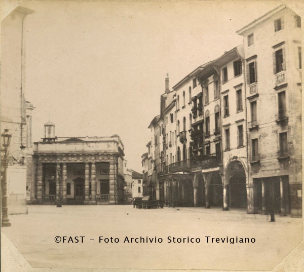 Treviso, Piazza dei Signori verso Corso del Popolo. A sinistra una piccola porzione di Palazzo dei trecento, e l'antica Loggia della Guardia, allora sede dei Pompieri e oggi scomparsa. A destra, il porticato sotto il quale si trovava il Caffè Commercio.
