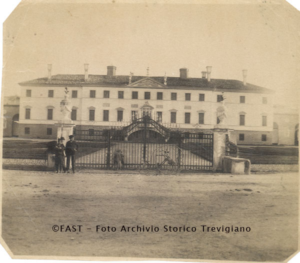Treviso, Villa Manfrin detta "Margherita": uomini accanto alla cancellata d'accesso e la facciata della villa.