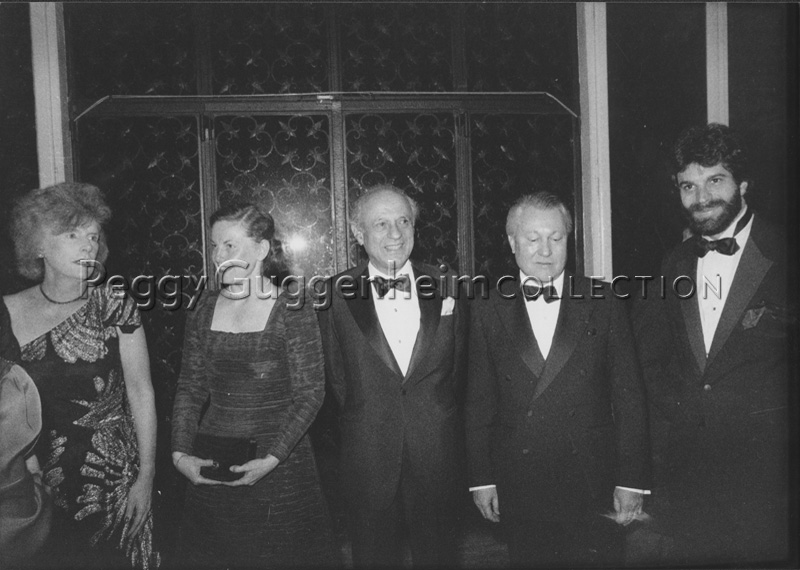 Dede Lawson-Johnston, Arthur Ross e la moglie, Thomas Messer e Clifford Ross, a Palazzo Venier dei Leoni, in occasione di un ricevimento; Venezia, 1985.