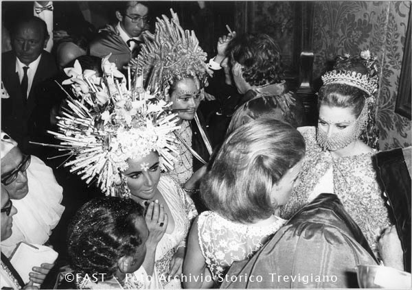 Gruppo di attori in costume di scena, tra cui spiccano il viso di Liz Taylor e Richard Burton di spalle.