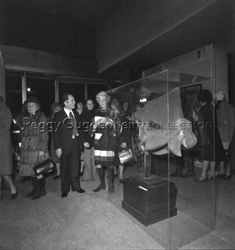 Peggy Guggenheim e altri durante l'inaugurazione della mostra dedicata alla Collezione Peggy Guggenheim, presso la Galleria Civica d'Arte Moderna di Torino, dal dicembre 1975 al febbraio 1976. Nella bacheca, la scultura di Boccioni, Dinamismo di un cavallo in corsa + case (1914–15).