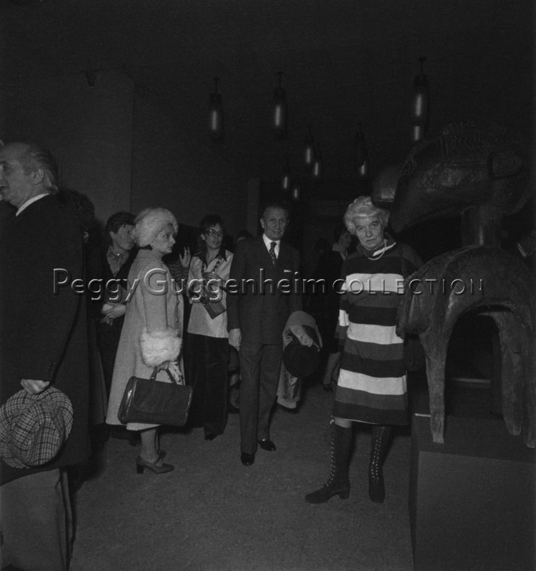 Peggy Guggenheim e altri durante l'inaugurazione della mostra dedicata alla Collezione Peggy Guggenheim, presso la Galleria Civica d'Arte Moderna di Torino, dal dicembre 1975 al febbraio 1976. Accanto a lei una delle sculture della sua collezione di arte etnica, "Maschera Yoka (Nimba)".