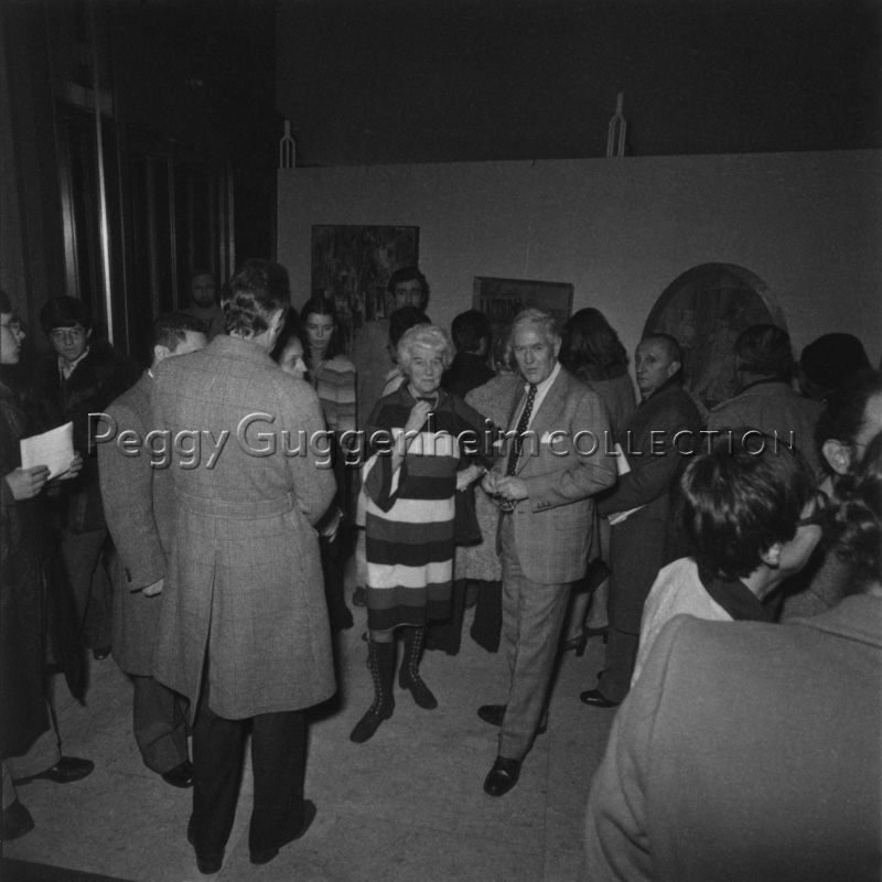 Peggy Guggenheim e altri durante l'inaugurazione della mostra dedicata alla Collezione Peggy Guggenheim, presso la Galleria Civica d'Arte Moderna di Torino, dal dicembre 1975 al febbraio 1976. Sulla parete alle sue spalle, da sinistra a destra, i dipinti di Picasso, "Il Poeta" (1911) e "Pipa, bicchiere, bottiglia di Vieux Marc" (1914), e "Il clarinetto" di Braque (1912).