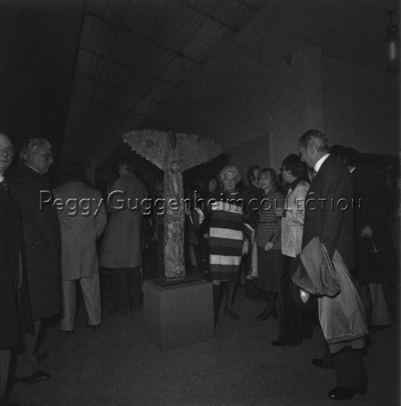 Peggy Guggenheim e altri durante l'inaugurazione della mostra dedicata alla Collezione Peggy Guggenheim, presso la Galleria Civica d'Arte Moderna di Torino, dal dicembre 1975 al febbraio 1976. Accanto a lei una delle sculture della sua collezione di arte etnica, "Intaglio ancestrale".