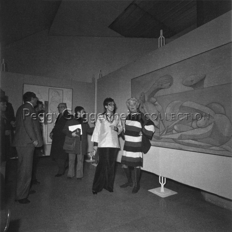 Peggy Guggenheim e altri durante l'inaugurazione della mostra dedicata alla Collezione Peggy Guggenheim, presso la Galleria Civica d'Arte Moderna di Torino, dal dicembre 1975 al febbraio 1976. Accanto a lei il dipinto di Picasso, "Sulla spiaggia (La Baignade)" (1937).