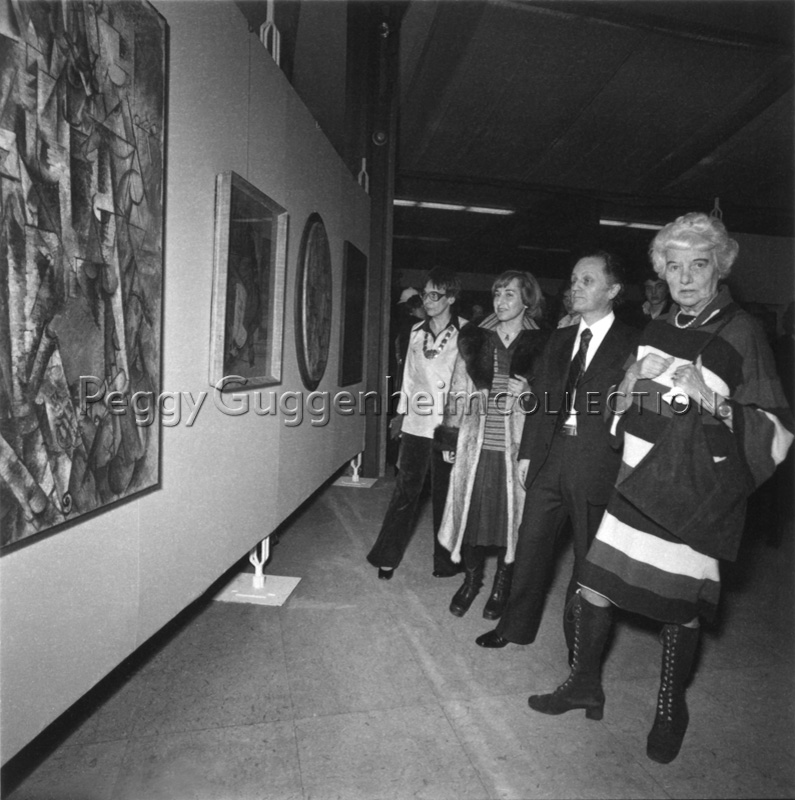 Peggy Guggenheim e altri durante l'inaugurazione della mostra dedicata alla Collezione Peggy Guggenheim, presso la Galleria Civica d'Arte Moderna di Torino, dal dicembre 1975 al febbraio 1976. Sulla parete di fronte a lei i dipinti di Picasso, "Il Poeta" (1911) e "Pipa, bicchiere, bottiglia di Vieux Marc" (1914), e "Il clarinetto" di Braque (1912).