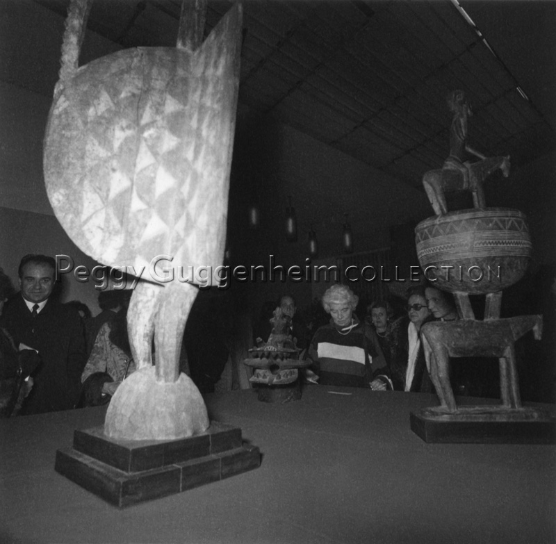 Peggy Guggenheim e altri durante l'inaugurazione della mostra dedicata alla Collezione Peggy Guggenheim, presso la Galleria Civica d'Arte Moderna di Torino, dal dicembre 1975 al febbraio 1976. Sul tavolo alcune sculture della sua collezione di arte etnica: a destra "Contenitore con coperchio" e "Uccello (Porpianong)" a sinistra.