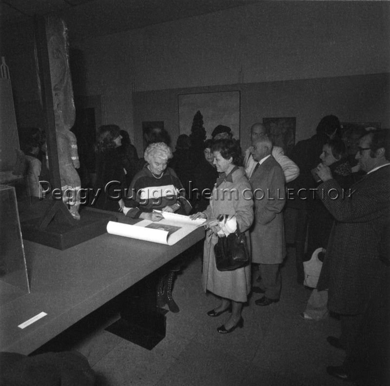 Peggy Guggenheim appone la sua firma durante l'inaugurazione della mostra dedicata alla Collezione Peggy Guggenheim, presso la Galleria Civica d'Arte Moderna di Torino, dal dicembre 1975 al febbraio 1976. Sul tavolo una scultura della sua collezione d'arte etnica: "Figura". Sullo sfondo è visibile il dipinto di Magritte, "L'impero della luce".