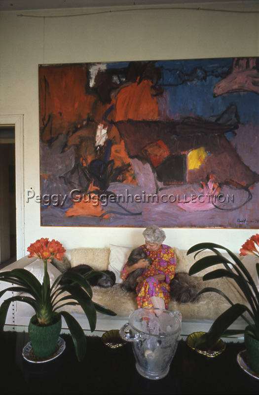 Peggy Guggenheim posa seduta sul divano, nel salotto di Palazzo Venier dei Leoni, con alcuni dei suoi cani Lhasa Apsos Terrier. Sulla parete alle sue spalle, il dipinto di Grace Hartigan, "Ireland" (1958); Venezia, 1975.