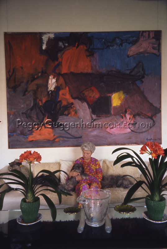 Peggy Guggenheim posa seduta sul divano, nel salotto di Palazzo Venier dei Leoni, con alcuni dei suoi cani Lhasa Apsos Terrier. Sulla parete alle sue spalle, il dipinto di Grace Hartigan, "Ireland" (1958); Venezia, 1975.
