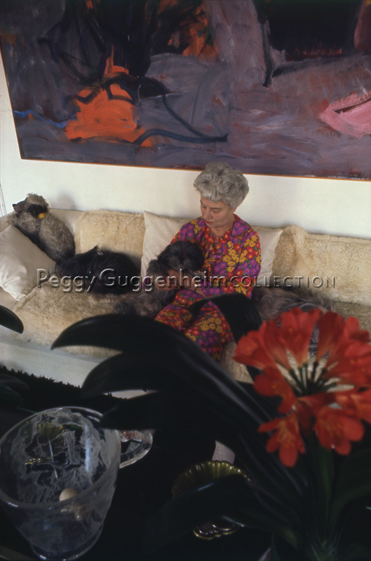 Peggy Guggenheim posa seduta sul divano, nel salotto di Palazzo Venier dei Leoni, con alcuni dei suoi cani Lhasa Apsos Terrier. Sulla parete alle sue spalle, il dipinto di Grace Hartigan, "Ireland" (1958); Venezia, 1975.
