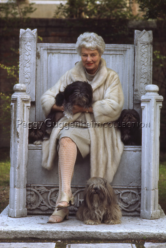 Peggy Guggenheim posa con alcuni dei suoi cani Lhasa Apsos Terrier, seduta sul suo 'trono bizantino', nel giardino di Palazzo Venier dei Leoni; Venezia, 1975.