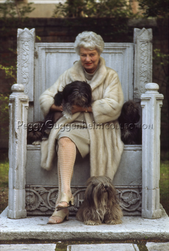 Peggy Guggenheim posa con alcuni dei suoi cani Lhasa Apsos Terrier, seduta sul suo 'trono bizantino', nel giardino di Palazzo Venier dei Leoni; Venezia, 1975.