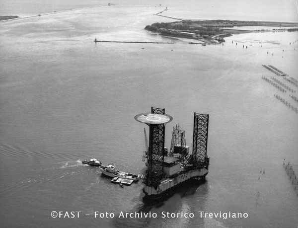 Venezia, piattaforma estrattiva di metano metre viene rimorchiata da Porto marghera verso il mare aperto.