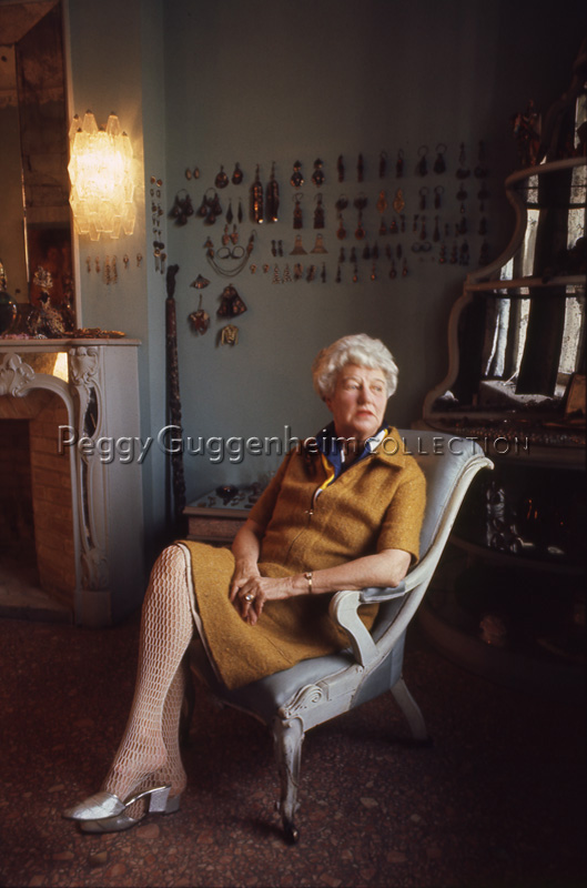 Peggy Guggenheim posa seduta su una poltroncina nella sua camera di Palazzo Venier dei Leoni. Sullo sfondo, sono appese alla parete alcune paia di orecchini ed altri monili della sua collezione. Venezia, 1975.