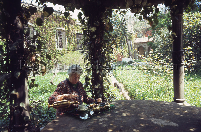 Peggy Guggenheim mentre prende il tè, seduta al tavolo in pietra nel giardino di Palazzo Venier dei Leoni. Venezia, 1975.