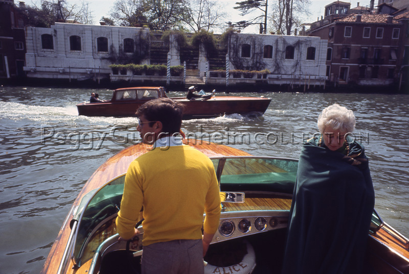 Peggy Guggenheim a bordo di un motoscafo; sullo sfondo la facciata sul Canal Grande di Palazzo Venier dei Leoni. Venezia, 1975.