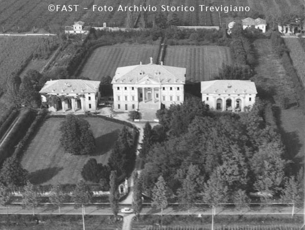 Venegazzù, ripresa aerea di Villa Spineda, Gasparini, Loredan. Si distingono il corpo centrale e le due barchesse laterali.