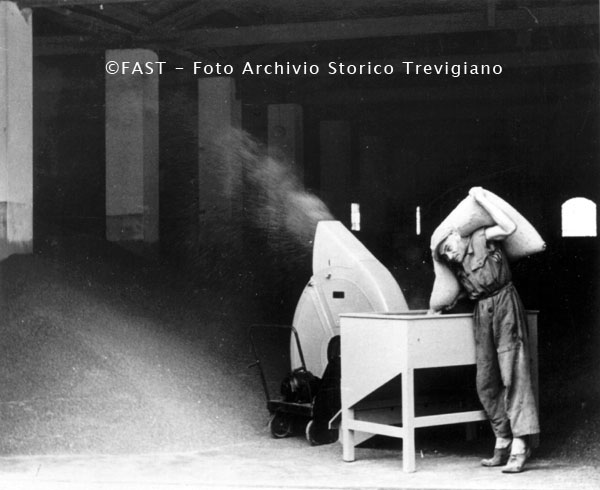 Treviso, stabilimento Magazzini Generali, spalatrice per cereali in azione.