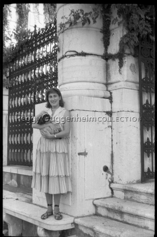 La moglie di Milton Gendel, Monica Incisa, con uno dei cani Lhasa Apsos di Peggy Guggenheim, in terrazza Marini di Palazzo Venier dei Leoni; Venezia, metà anni '50 / negativo / Anonimo; / 1950 ( ca. )
