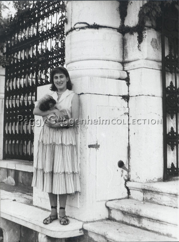 La moglie di Milton Gendel, Monica Incisa, con uno dei cani Lhasa Apsos di Peggy Guggenheim, in terrazza Marini di Palazzo Venier dei Leoni; Venezia, metà anni '50.