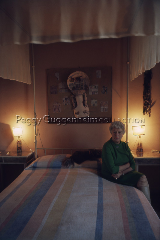 Peggy Guggenheim, nella camera degli ospiti di Palazzo Venier dei Leoni; alle sue spalle un'opera di Mina Loy, "Househunting" (1950 ca.), che oggi appartiene a Carolyn Burke (biografa dell'artista), cui fu regalata da Sinbad Vail, figlio di Peggy. Venezia, 1975.
