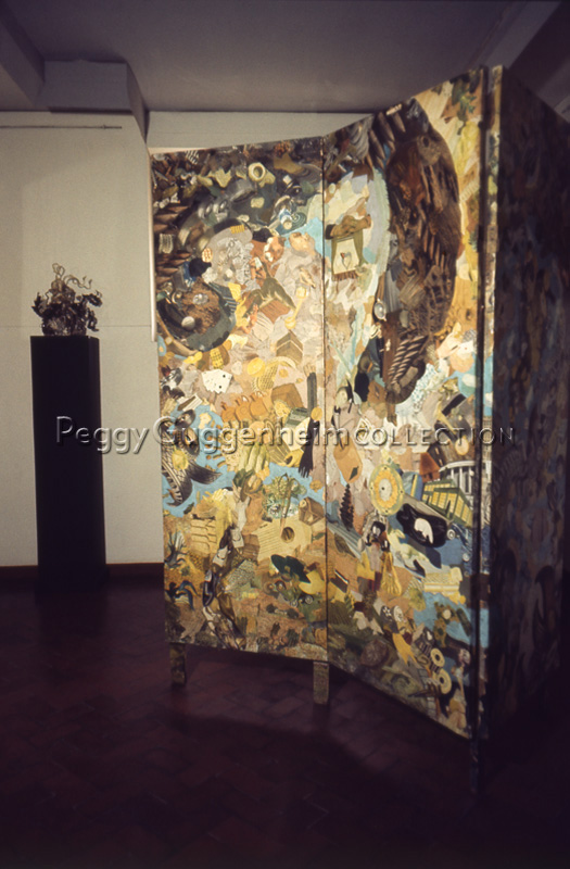 Il "Paravento" di Laurence Vail esposto nella barchessa di Palazzo Venier dei Leoni. Venezia, 1975.