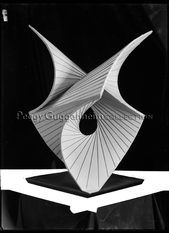 La scultura di Antoine Pevsner, "Superficie sviluppabile" (1938-39), della Peggy Guggenheim Collection. Fotografata per l'edizione del Catalogo della Galleria "Art of this Century", che Peggy Guggenheim aprì a New York nel 1941.