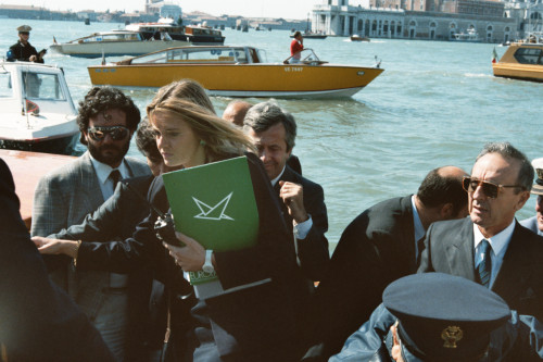 Ripresa di alcune persone all'aperto in attesa dell'arrivo di Giulio Andreotti, allora Ministro degli Esteri, in occasione del Convegno internazionale "Giornate delle genti e delle regioni d'Europa" (Venezia 14-21 settembre 1986) promosso dalla Regione del Veneto con la collaborazione della Fondazione Giorgio Cini e de La Biennale di Venezia.
