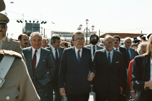 Venezia. L'arrivo di Giulio Andreotti, allora Ministro degli Esteri, in occasione del Convegno internazionale "Giornate delle genti e delle regioni d'Europa" (Venezia 14-21 settembre 1986) promosso dalla Regione del Veneto con la collaborazione della Fondazione Giorgio Cini e de La Biennale di Venezia. Alla sua destra compare Carlo Bernini, all'epoca Presidente della Regione del Veneto, alla sua sinistra Vittore Branca.