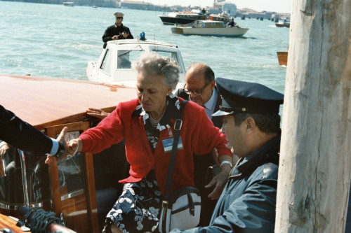 Venezia. L'arrivo, in un taxi acqueo, di Vittore Branca in occasione del Convegno internazionale "Giornate delle genti e delle regioni d'Europa" (Venezia 14-21 settembre 1986) promosso dalla Regione del Veneto con la collaborazione della Fondazione Giorgio Cini e de La Biennale di Venezia.