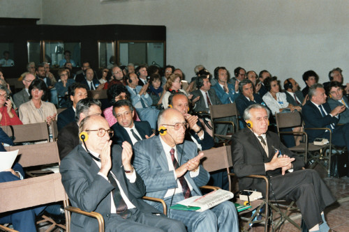 Ripresa del pubblico in occasione del Convegno internazionale "Giornate delle genti e delle regioni d'Europa" (Venezia 14-21 settembre 1986) promosso dalla Regione del Veneto con la collaborazione della Fondazione Giorgio Cini e de La Biennale di Venezia. Tra i presenti compaiono Giulio Andreotti, all'epoca Ministro degli Esteri, Carlo Bernini, all'epoca Presidente della Regione del Veneto e Vittore Branca.