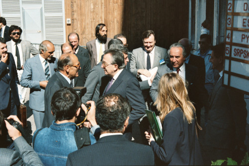 Venezia. L'uscita di Giulio Andreotti, allora Ministro degli Esteri, da Palazzo Ducale in occasione del Convegno internazionale "Giornate delle genti e delle regioni d'Europa" (Venezia 14-21 settembre 1986) promosso dalla Regione del Veneto con la collaborazione della Fondazione Giorgio Cini e de La Biennale di Venezia; alla sua destra Carlo Bernini, all'epoca Presidente della Regione del Veneto, alla sua sinistra Vittore Branca.