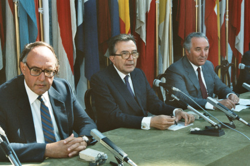 Venezia. Giulio Andreotti, allora Ministro degli Esteri, in occasione del Convegno internazionale "Giornate delle genti e delle regioni d'Europa" (Venezia 14-21 settembre 1986) promosso dalla Regione del Veneto con la collaborazione della Fondazione Giorgio Cini e de La Biennale di Venezia. Alla sinistra di Andreotti compare Carlo Bernini, all'epoca Presidente della Regione del Veneto.