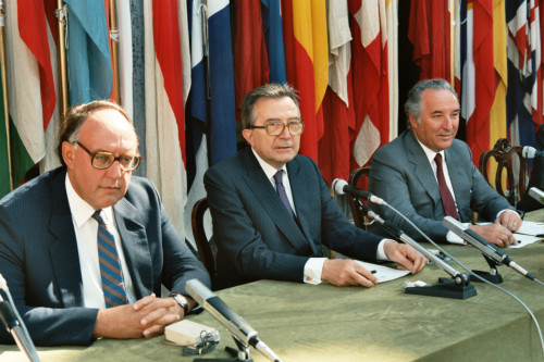 Venezia. Giulio Andreotti, allora Ministro degli Esteri, in occasione del Convegno internazionale "Giornate delle genti e delle regioni d'Europa" (Venezia 14-21 settembre 1986) promosso dalla Regione del Veneto con la collaborazione della Fondazione Giorgio Cini e de La Biennale di Venezia. Alla sinistra di Andreotti compare Carlo Bernini, all'epoca Presidente della Regione del Veneto.