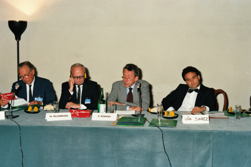 Venezia. Intervento di S. Romano in occasione del Convegno internazionale "Giornate delle genti e delle regioni d'Europa" (Venezia 14-21 settembre 1986) promosso dalla Regione del Veneto con la collaborazione della Fondazione Giorgio Cini e de La Biennale di Venezia. Presenti anche Hillenbrand e Juarez.