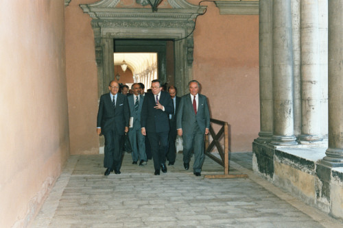 Giulio Andreotti accompagnato da Vittore Branca, alla sua sinistra e Carlo Bernini, alla sua destra, al termine di una riunione in occasione del Convegno internazionale "Giornate delle genti e delle regioni d'Europa" (Venezia 14-21 settembre 1986) promosso dalla Regione del Veneto con la collaborazione della Fondazione Giorgio Cini e de La Biennale di Venezia.