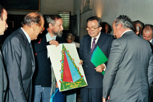 Giulio Andreotti, Vittore Branca (al centro) e Carlo Bernini (di spalle) in occasione del Convegno internazionale "Giornate delle genti e delle regioni d'Europa" (Venezia 14-21 settembre 1986) promosso dalla Regione del Veneto con la collaborazione della Fondazione Giorgio Cini e de La Biennale di Venezia.