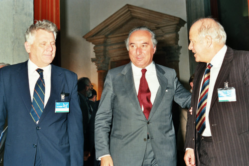 Carlo Bernini, al centro, con due rappresentanti delle nazioni partecipanti in occasione del Convegno internazionale "Giornate delle genti e delle regioni d'Europa" (Venezia 14-21 settembre 1986) promosso dalla Regione del Veneto con la collaborazione della Fondazione Giorgio Cini e de La Biennale di Venezia.