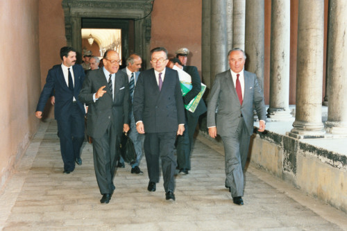Giulio Andreotti accompagnato da Vittore Branca, alla sua sinistra e Carlo Bernini, alla sua destra, al termine di una riunione in occasione del Convegno internazionale "Giornate delle genti e delle regioni d'Europa" (Venezia 14-21 settembre 1986) promosso dalla Regione del Veneto con la collaborazione della Fondazione Giorgio Cini e de La Biennale di Venezia.