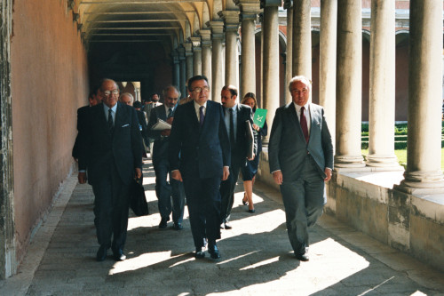 Giulio Andreotti accompagnato da Vittore Branca, alla sua sinistra e Carlo Bernini, alla sua destra, al termine di una riunione in occasione del Convegno internazionale "Giornate delle genti e delle regioni d'Europa" (Venezia 14-21 settembre 1986) promosso dalla Regione del Veneto con la collaborazione della Fondazione Giorgio Cini e de La Biennale di Venezia.