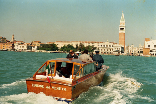 Gli esponenti italiani di ritorno dall'Isola di San Giorgio in occasione del Convegno internazionale "Giornate delle genti e delle regioni d'Europa" (Venezia 14-21 settembre 1986) promosso dalla Regione del Veneto con la collaborazione della Fondazione Giorgio Cini e de La Biennale di Venezia.