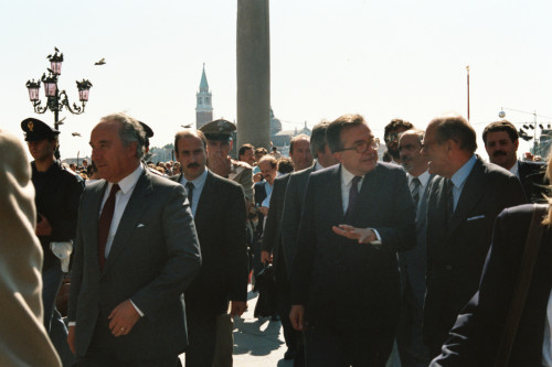 L'arrivo di Giulio Andreotti in Piazza San Marco, accompagnato da Vittore Branca alla sua destra e Carlo Bernini, alla sua sinistra in occasione del Convegno internazionale "Giornate delle genti e delle regioni d'Europa" (Venezia 14-21 settembre 1986) promosso dalla Regione del Veneto con la collaborazione della Fondazione Giorgio Cini e de La Biennale di Venezia.
