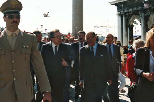 L'arrivo di Giulio Andreotti, accompagnato da Vittore Branca, alla sua destra, in occasione del Convegno internazionale "Giornate delle genti e delle regioni d'Europa" (Venezia 14-21 settembre 1986) promosso dalla Regione del Veneto con la collaborazione della Fondazione Giorgio Cini e de La Biennale di Venezia.