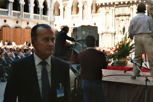 Ritratto maschile ripreso in occasione di una conferenza presenziata da Giulio Andreotti, durante il Convegno internazionale "Giornate delle genti e delle regioni d'Europa" (Venezia 14-21 settembre 1986) promosso dalla Regione del Veneto con la collaborazione della Fondazione Giorgio Cini e de La Biennale di Venezia.