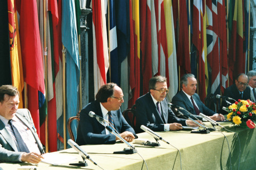 Giulio Andreotti, all'epoca Ministro degli Esteri, in occasione di un intervento durante il Convegno internazionale "Giornate delle genti e delle regioni d'Europa" (Venezia 14-21 settembre 1986) promosso dalla Regione del Veneto con la collaborazione della Fondazione Giorgio Cini e de La Biennale di Venezia; alla sua sinistra Carlo Bernini, all'epoca Presidente della Regione del Veneto e Vittore Branca.