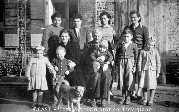 (In piedi) Santa Bertuola, Giuseppe Bertuola, Luigia Bertuola, Giuseppina Bertuola, i nonni: Angela Mattarollo, Bortolomeo Bertuola, i nipoti, da sinistra: Ivana Colusso, Germano Genovese, Maurizio Genovese, Paolo Colusso, Bruna Colusso e la cagnetta lillina (a. 1952).
