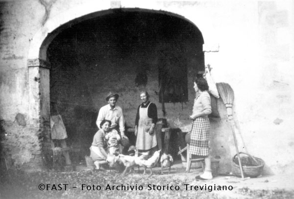 Giuseppe (Nino) Pietrobon con la madre Marta (Carlotta) Favaro, la moglie Rosalia (Maria) Soligo con in braccio il figlio Giancarlo Pietrobon e una vicina Maria Biondo (a. 1948).