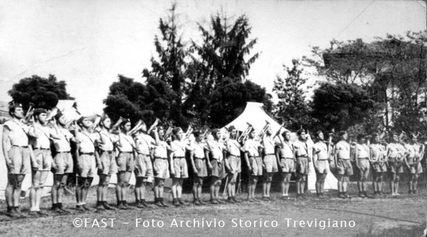 Gruppo di Balilla in parata con gli strumenti musicali a Paese (a. 1942).