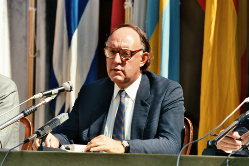 Ritratto di un uomo durante un intervento al convegno presenziato da Giulio Andreotti, in occasione del Convegno internazionale "Giornate delle genti e delle regioni d'Europa" (Venezia 14-21 settembre 1986) promosso dalla Regione del Veneto con la collaborazione della Fondazione Giorgio Cini e de La Biennale di Venezia.